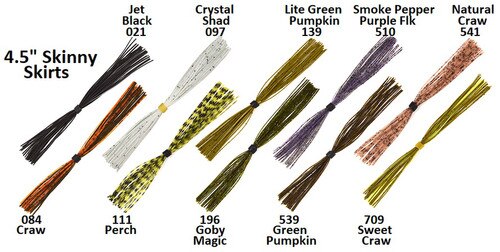 I love the smaller more subtle profile of these skirts. Great for smallmouth bass! I added these to the F2 Viper jig and they flat out get bit! As a trailer try the Pinpoint minnow, or Tubro tail craw in the 2.75 size. You can thank me later!