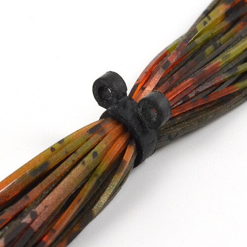 Silicone skirts are made using a variety of different “collars”, which are the bands that hold the strands together in the middle of the skirt. Standard skirts generally use the simple bands. However, there are bands that feature attachments that allow user to add one or two rattles to the skirt after it is assembled. These are sometimes called “rattle collars” or “mickey mouse” collars due to their shape. Rattles must be bought separately and attached after skirt is assembled on jig or lure. More recent collars include “pro-tie” collars that enable skirt material to “flare out” more and also allows the silicone colors to be intentionally separated and specific patterns to be maintained in the skirt. These collars can be made of rubber or silicone and generally have a larger center hole allowing skirt to slide on an off your lure more easily, without tearing up the skirt in the process.