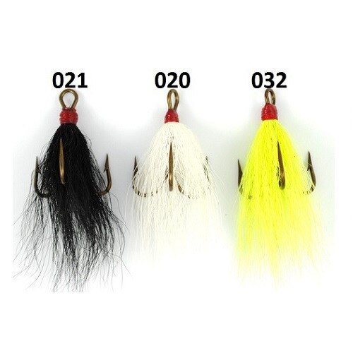 These dressed trebles are tied with premium quality deer hair. Tie thread is red in color and seal coated for durability. Great for in-line spinners and popper trailer hooks. Choose from 3 popular colors. Three tied trebles per pack. Mix and match colors for quantity discounts.