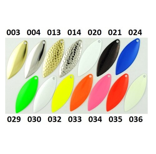 Our Premium Finish willow leaf spinner blades are the best your money can buy. The Premium colors include highly polished Lacquered Brass, super shiny Bright Nickel and a rainbow of vivid fluorescent colors. Our Nickel and Brass blades are stamped from high grade brass while the bright colored steel blades are painted on both sides. All Stamina willow leaf fishing lure blades are made in America. SEE "Specifications" Tab for blade dimensions